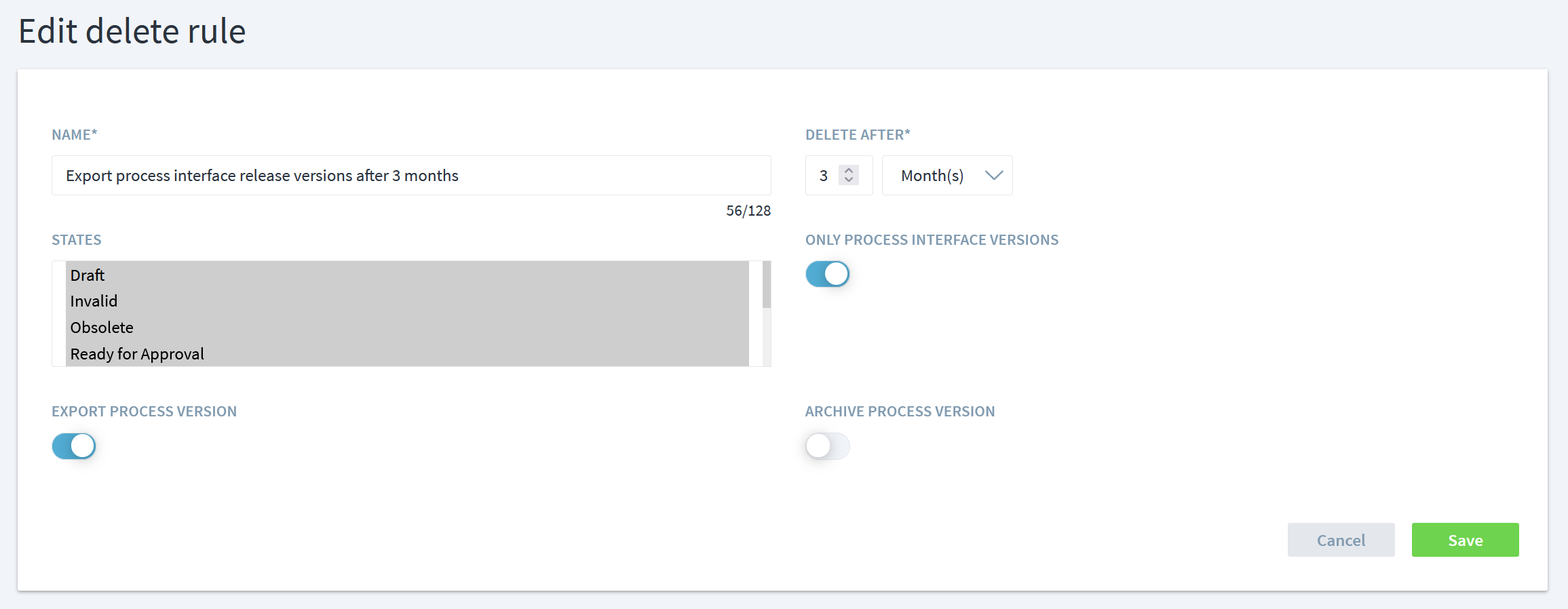 The sample rule in the screenshot above selects all process versions that were created as process interface release versions in any state, that are at least three months old, and creates an export, but no archive, before the process version is deleted.