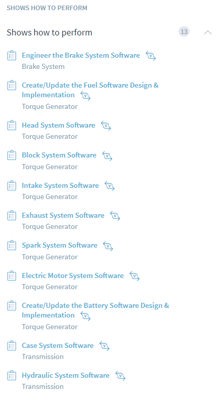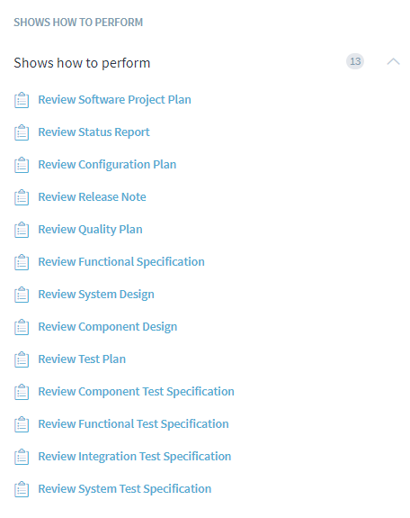 On the other hand, all the processes that use the generic process can be viewed in the Shows How to Perform widget of the generic process. A Joint Review process contains the peer review details which are used in review activities for different workflows like project management, system and component design, etc.