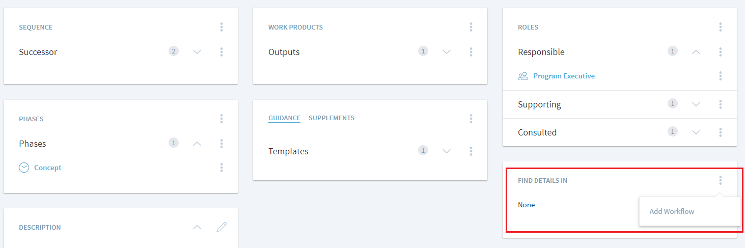 Only activities in a workflow can be linked to generic process. For example, in Project management, 'Review Software Project Plan' activity refers to the 'Joint Review' workflow to show how to perform the review. When a user clicks on this activity, they will view the joint review process below the project management workflow.