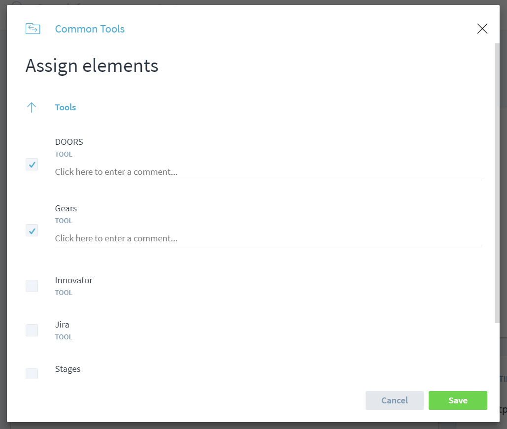 A lot of organizations have a standard set of tools that need to be consistenly used across all processes. These elements are best managed in a central process module, typically called “Common Tools” or similar. If these sets grow beyond a certain size, integrating them all in every process might become cumbersome, especially if you are only using a few of those roles or tools in your process.