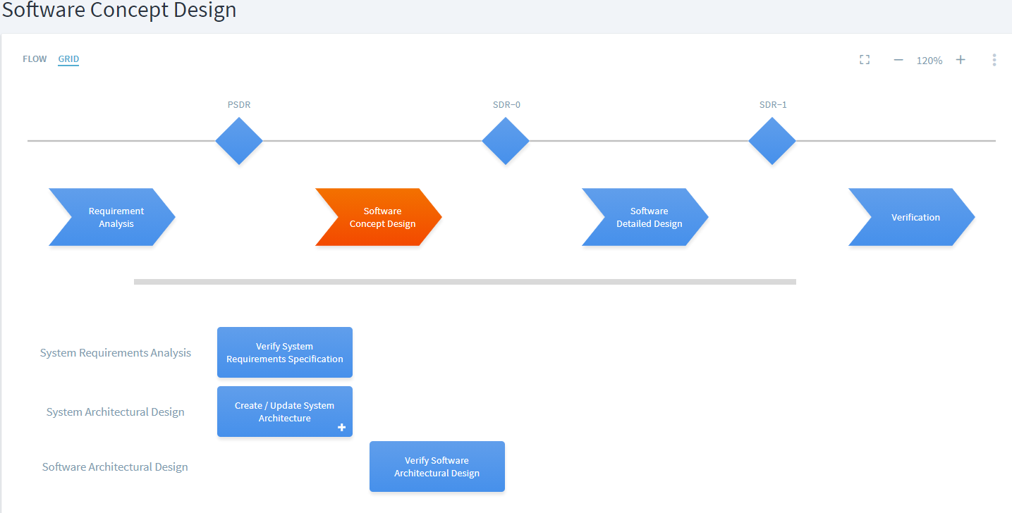 The grid view offers a very reduced visualization of the activity flow. It shows the activities in sequence, either through direct predecessor or successor activities, or through inputs and output work products.