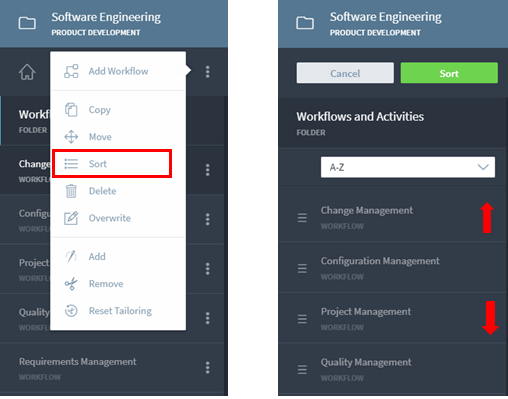 The steps to sort workflow and activity /decision is the same. For workflow, you will navigate to Workflow and Activities by clicking on it. Then choose ‘Sort’ by selecting the three dots as shown for our workspace ‘Software Engineering’.