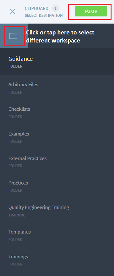Once the element to be copied has been selected, navigate to the folder in same workspace or different workspace and click or tap on 'Paste' to copy the element.