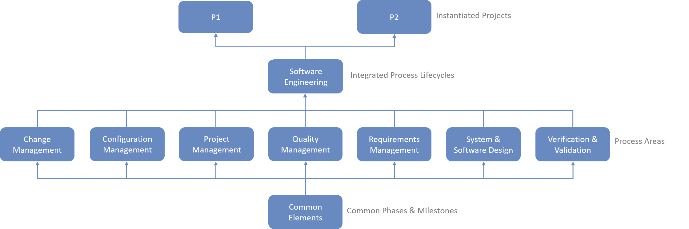 Furthermore, all the process areas are integrated into a single Standard Process called ‘Software Engineering’ workspace which contains all their process elements (workflows, activities, roles, phases & milestones, work products, and guidance).