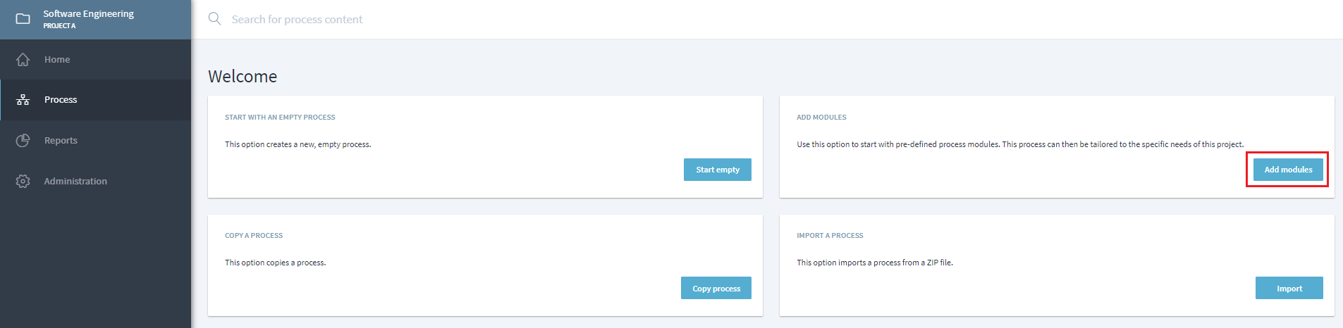 In order to integrate a process into the next level, use the option Add module on the Process start page. In our example, once the Software Engineering workspace is created, all the process areas are added at one go by using the Add module option. The recommended practice is to select the valid version of the processes to be added.