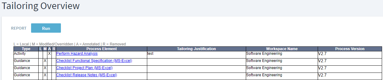 Along with above information, report also displays the tailoring justification, workspace where it is located as well as process version for which tailoring report is generated.