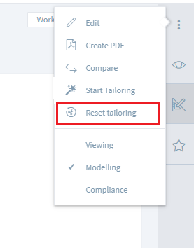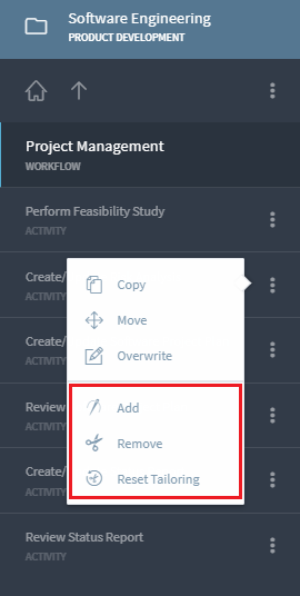 To manually tailor an element in or out of the process, click or tap on three dots next to the element's name and select Add or Remove respectively. You can also reset the tailoring rule for a given element, by clicking or tapping on Reset Tailoring.