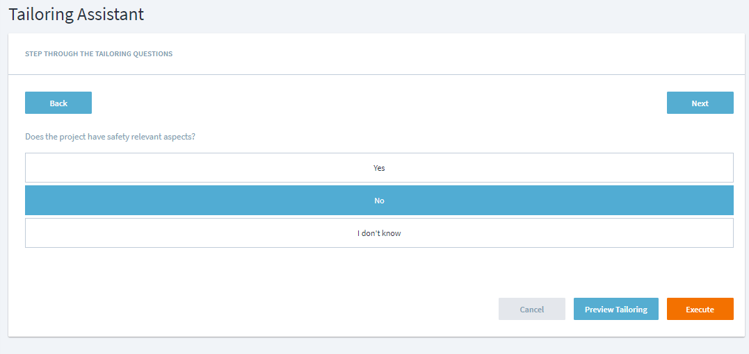 The tailoring assistant will step through the tailoring questions and answers that are modeled into the processes.