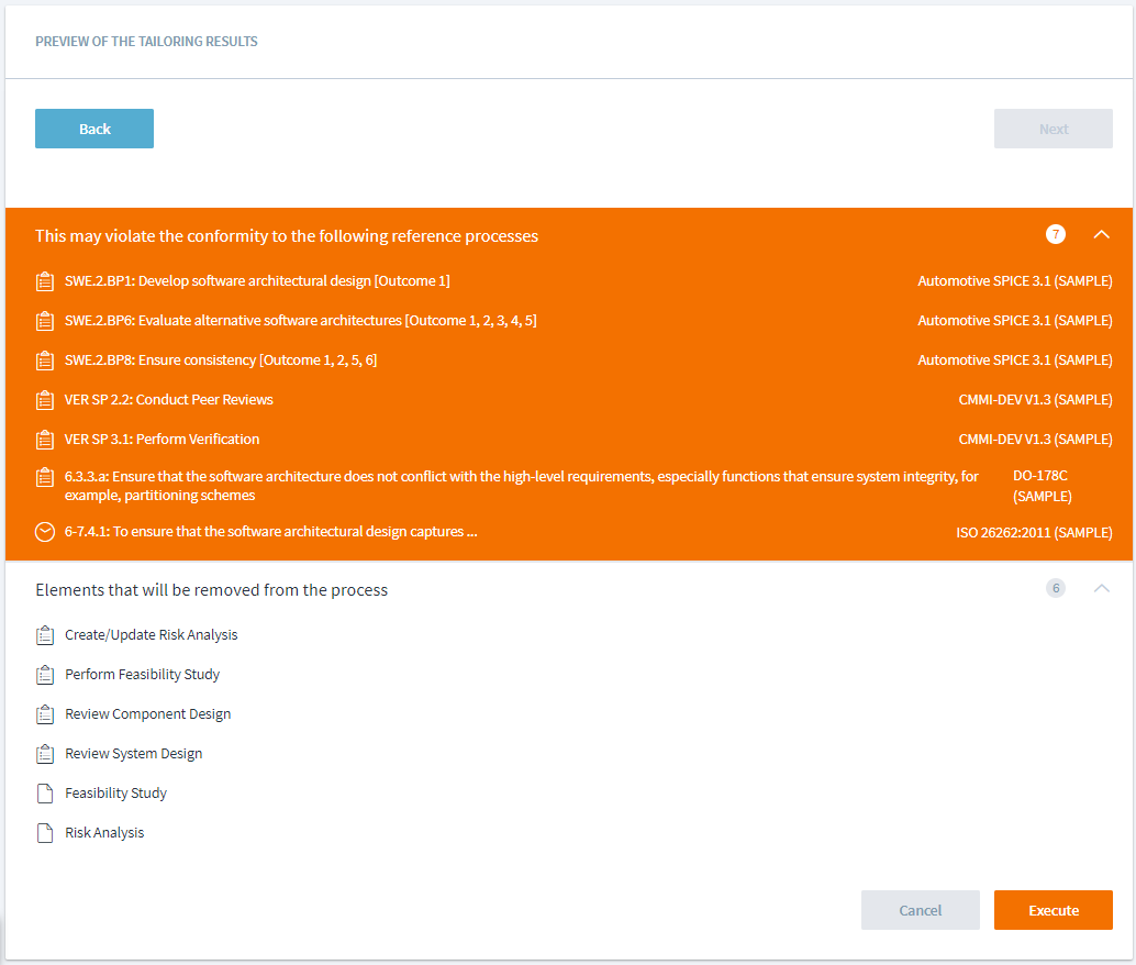 If process elements that are mapped to any reference standards will be tailored away, Stages warns you about potential compliance violations. For example, if project classification is answered as low risk, elements related to risk will be removed from the process and warning related to potential violation of reference standards mapped to these elements will be displayed.