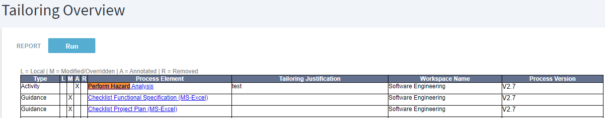 Alognwith above information, report also displays the tailoring justification, workspace where it is located as well as process version for which tailoring report is generated.