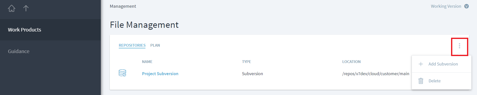Navigate to Management > File Management > Work Products and click on three dots on top left to add or delete a repository.