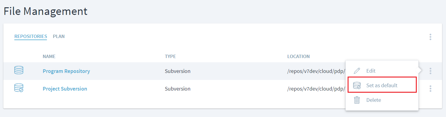 Multiple repositories can be set up to manage work products for any workspace. Mark a specific repository default by clicking on three dots next to repository name and selecting Set as default.