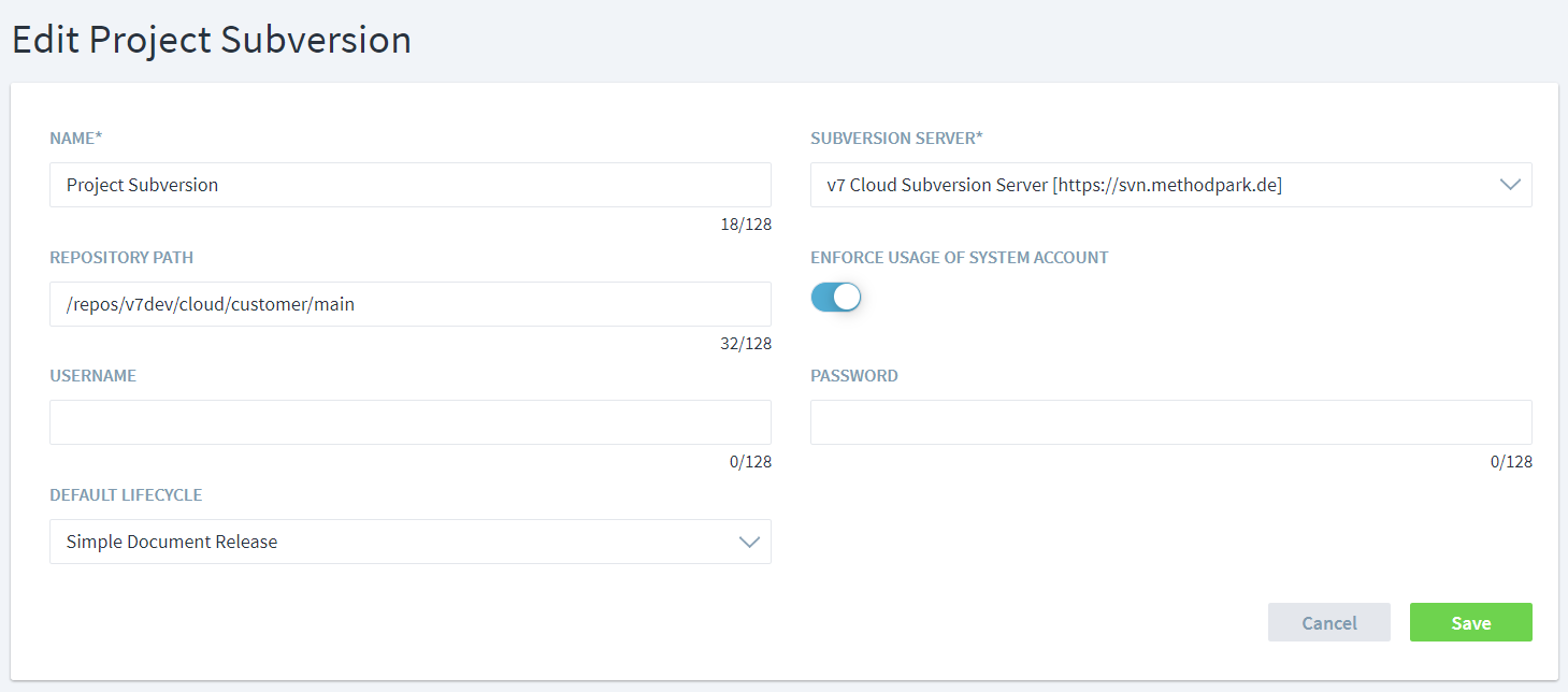 Provide the details including the path for the repository. If you select to enforce usage of system account, users will not be prompted to enter their user credentials to check file in and out of the repository or change states. Instead the credentials that they used to log into Stages, will be used on the linked CM account.