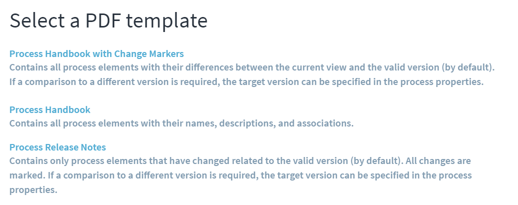User will be presented with option to download selected process element with varying level of details based on template selected. For workflow and activities, there will additional options in the menu to download the process level diagram.
