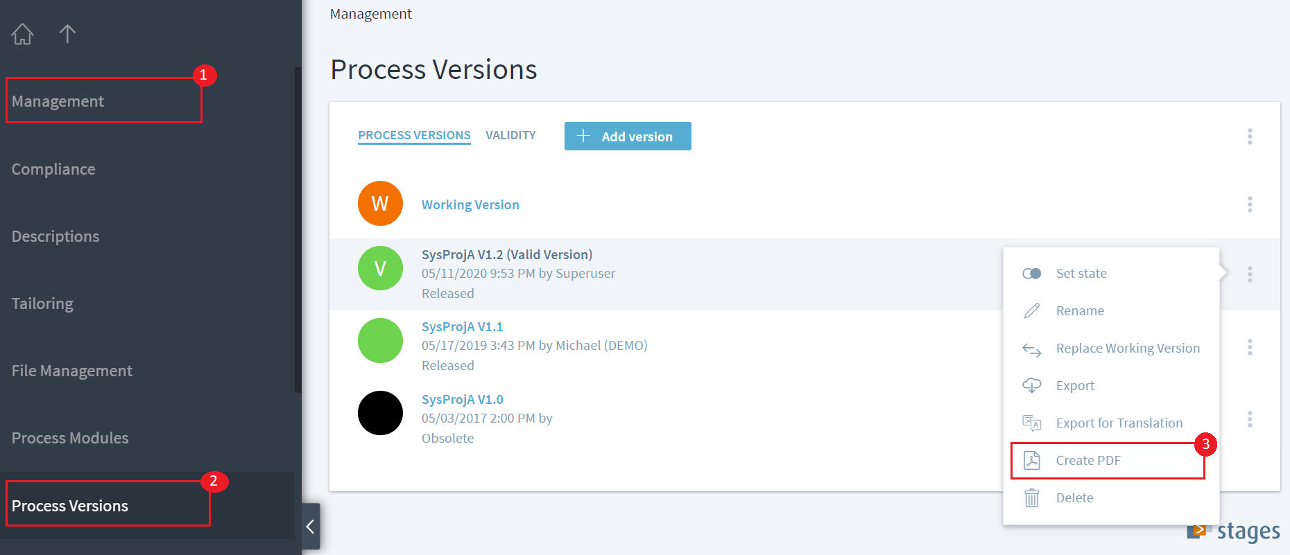 Alternatively, process export can also be generated by navigating to Management > Process Version and selecting CreatePDF option for any of the process versions.