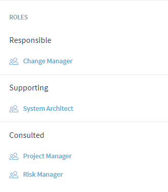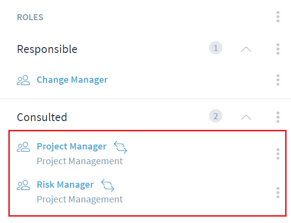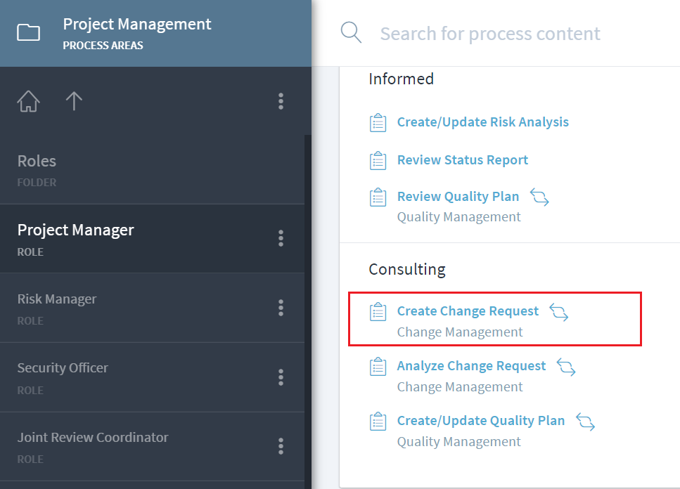 Process interfaces allows creation and management of process elements in the processes they belong to. It also fosters communication between functions about their dependencies on each other. Process interfaces are indicated by double-arrow icon and name of workspace they belong to. In the following example, an activity in the Change Management process requires the consultation of the Project Manager and Risk Manager roles which reside in the Project Management workspace. This creates a process interface between the two workspaces.