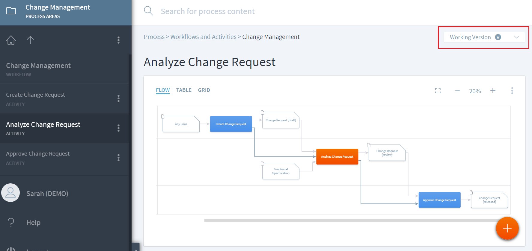 If after establishing interface shown above Change Management workspace has process version released, while the Project Management does not, then as shown below newly released process version will fail to show the interface with Project Manager as Consulted role.