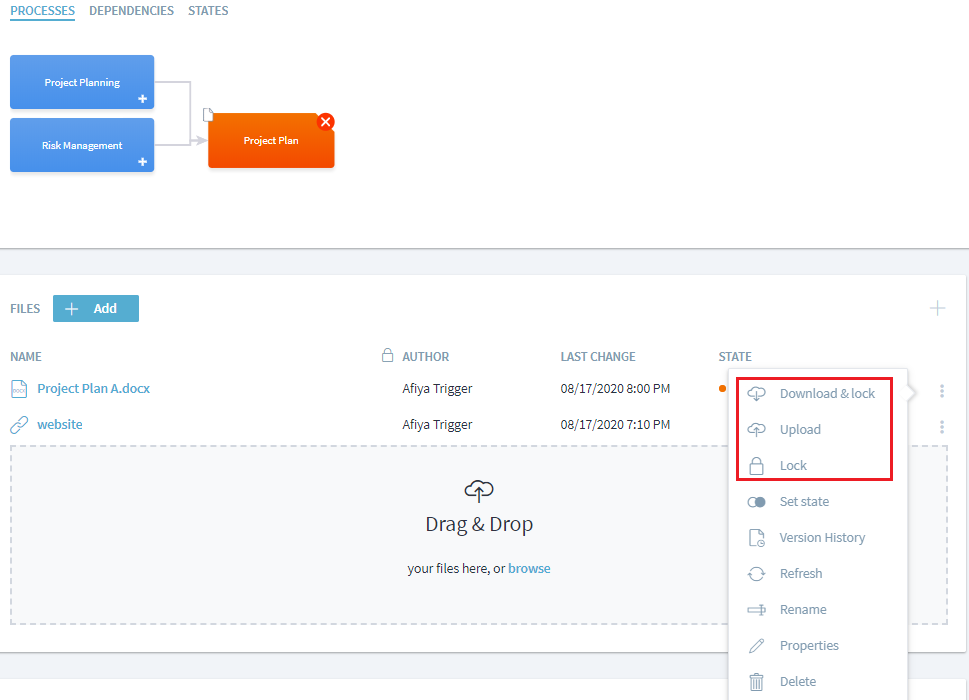 To work on an existing file, check it out by clicking on Download & lock. This will prevent another user from downloading or checking in another version of the file. Alternatively, you can simply Lock the file to prevent another user from editing the file.
