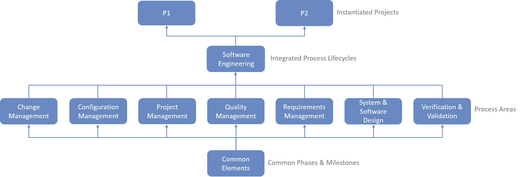Above is an example of process architecture. Since common elements like phases & milestones, common roles (e.g. stakeholders) are defined at the corporate level, they have been defined in a workspace called ‘Common Elements’. This workspace is then integrated into each Process Area workspace.