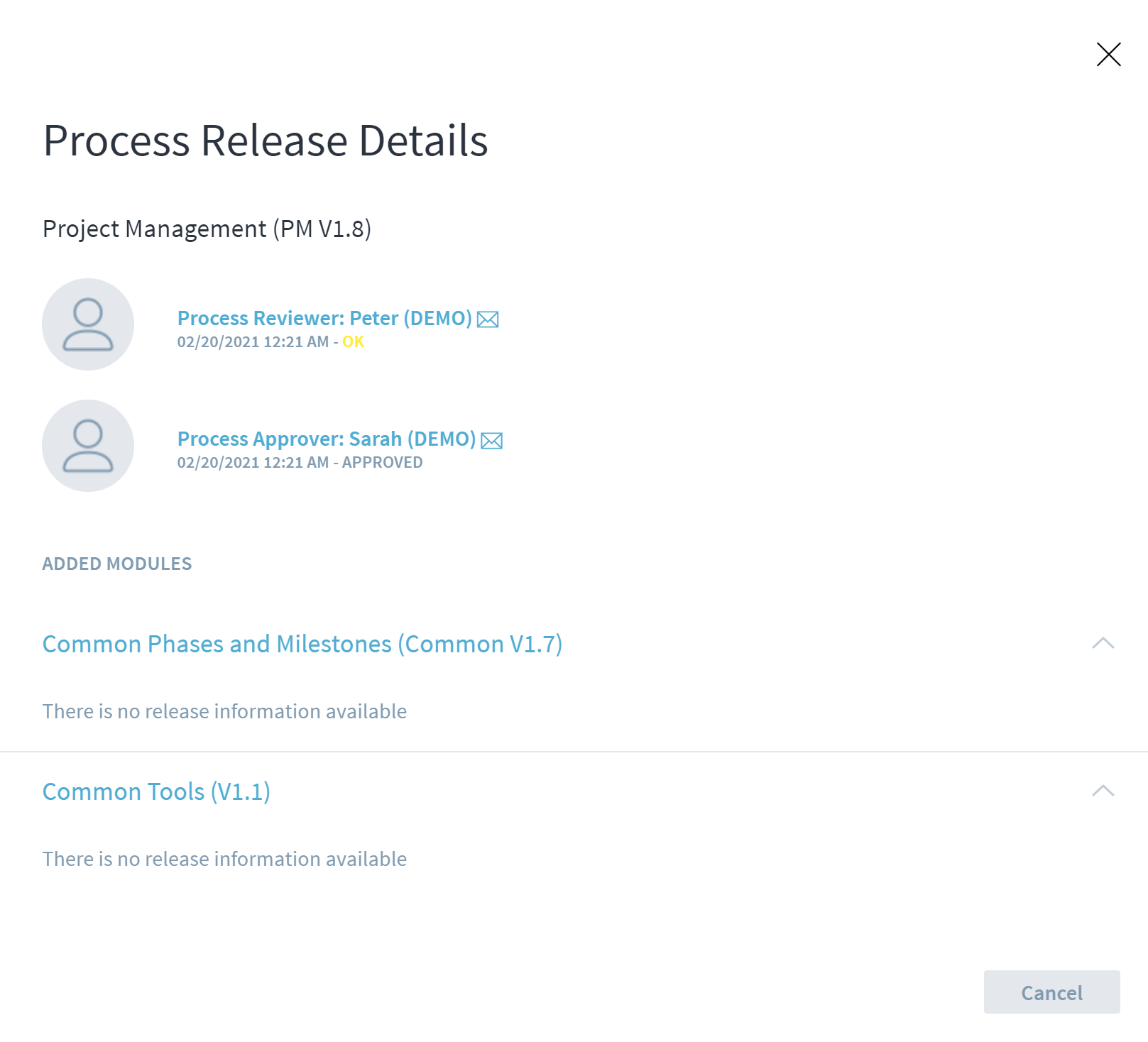 The following page shows the reviewers and approvers of the current process. If the process was built from process modules that were also automatically released, their respective release details are also shown.