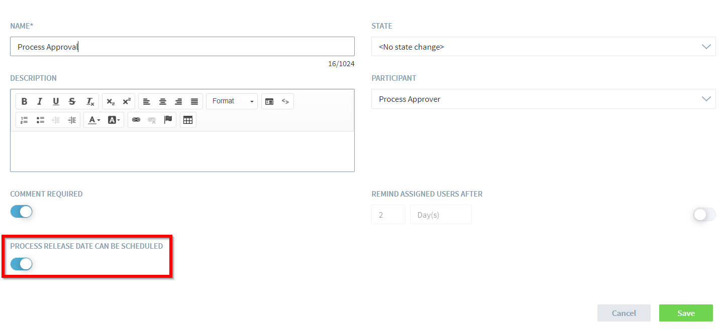 Some process changes should be made effective at a specific date, e.g. at the first day of a month. With Stages 7.7, the release automations can be configured so reviewers and/or approvers can set a specific date and time when the process will be released and marked as valid.