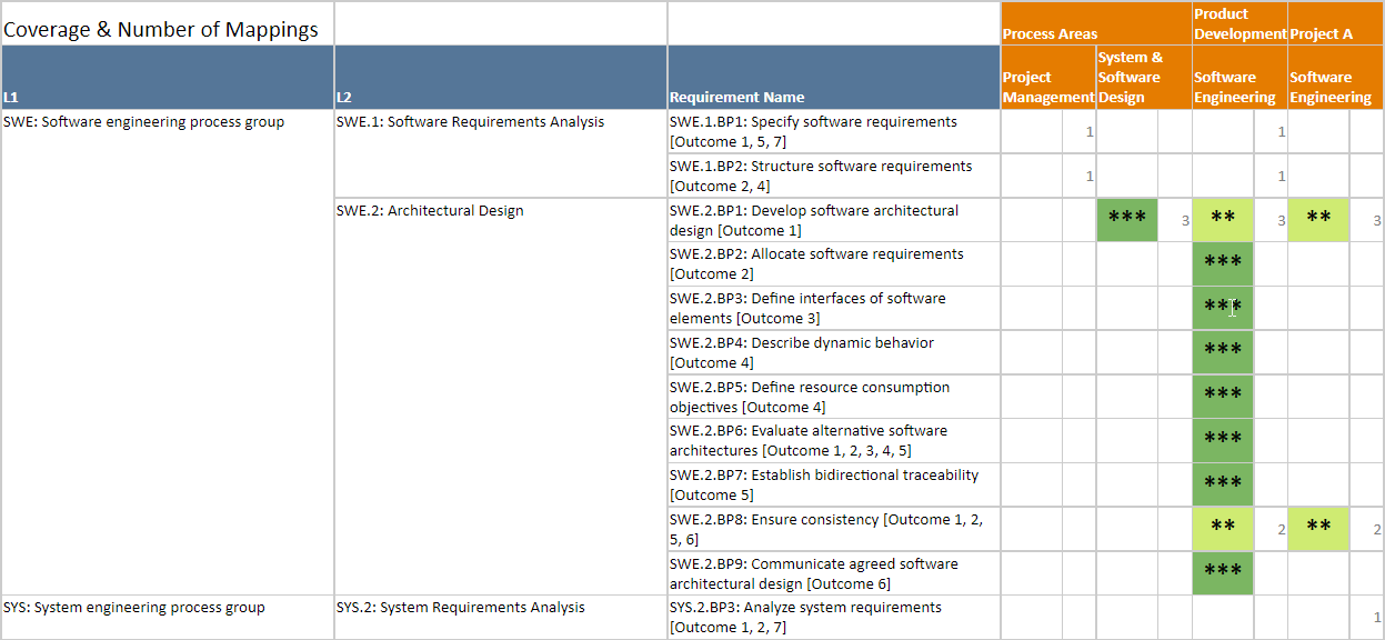 As the report shows both the coverage and the number of mappings for a particular standard requirement, it is also useful to detect mappings that have been created, but not rated for a specific coverage yet.