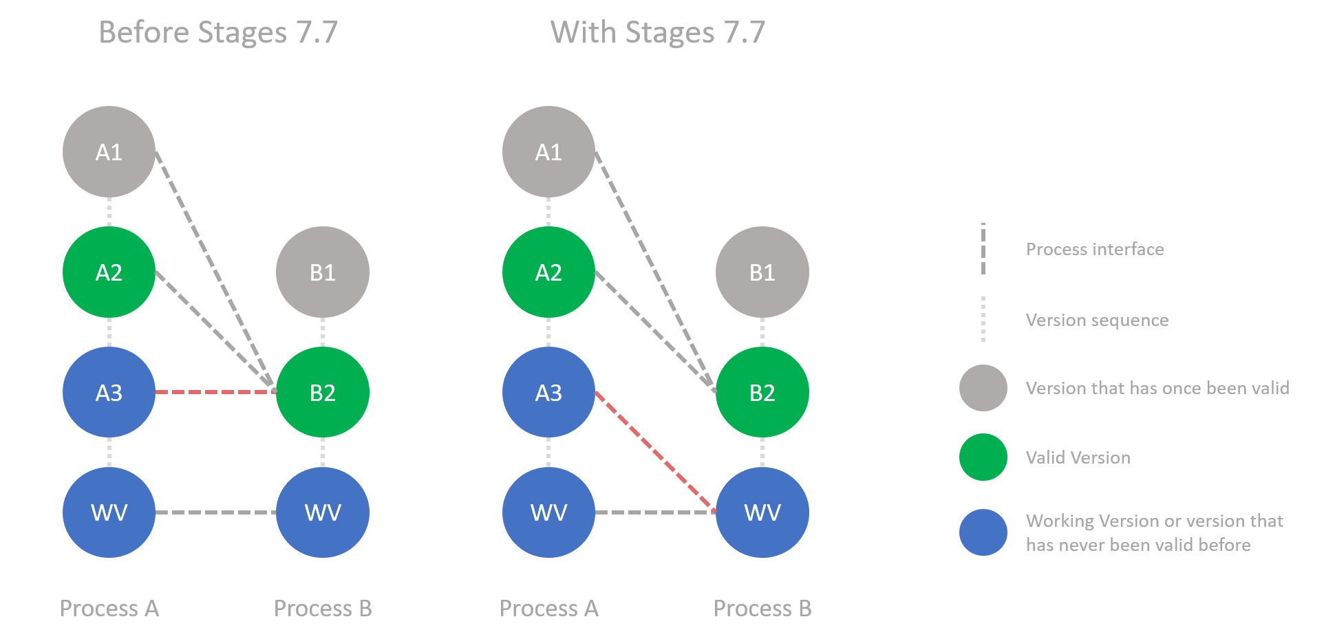 Before version 7.7, interfaces were shown between process versions with the same name. This capability has been removed.