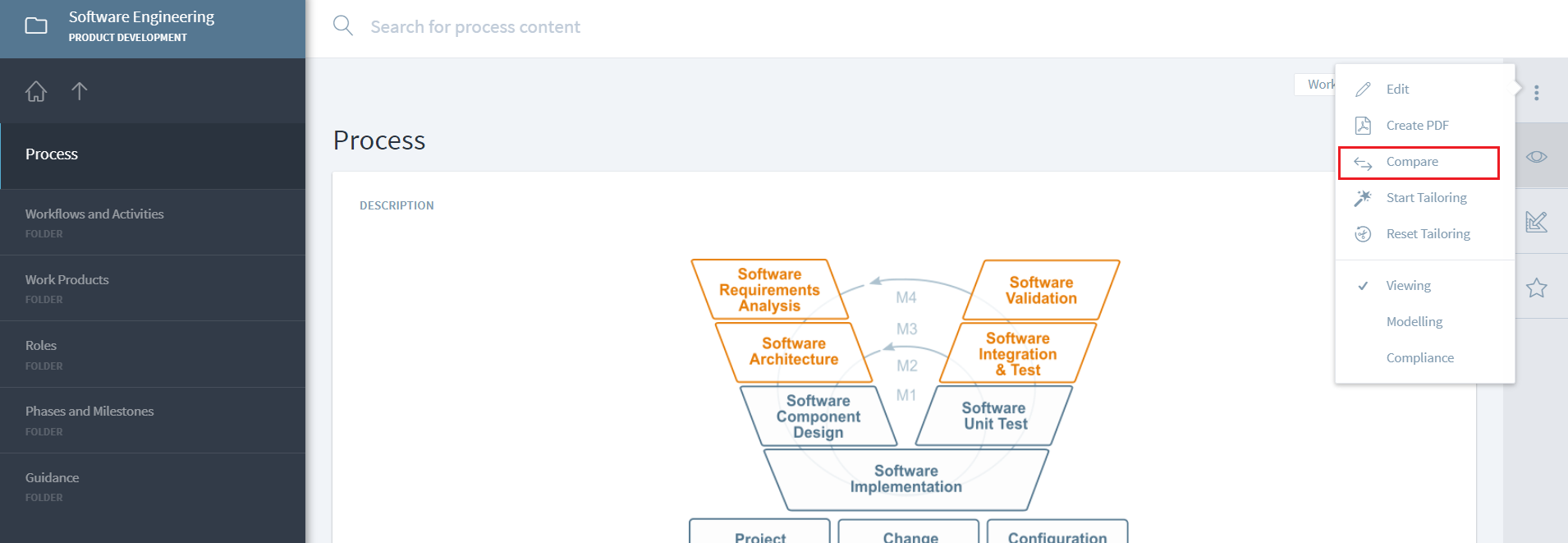 Stages allow users to compare different processes directly in the tool easily. Comparison can be started on the Process main page via the Compare menu.