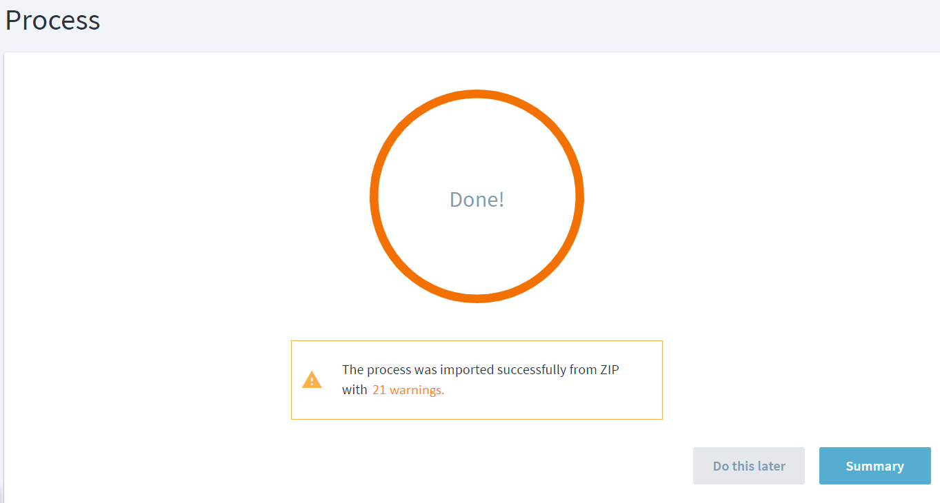 4. Once the process has been imported successfully, it will be displayed as Done. It will also show warnings which can be reviewed right away by clicking on warnings or summary. To view the warnings later, navigate to Management > Process Version and click on the warning symbol.