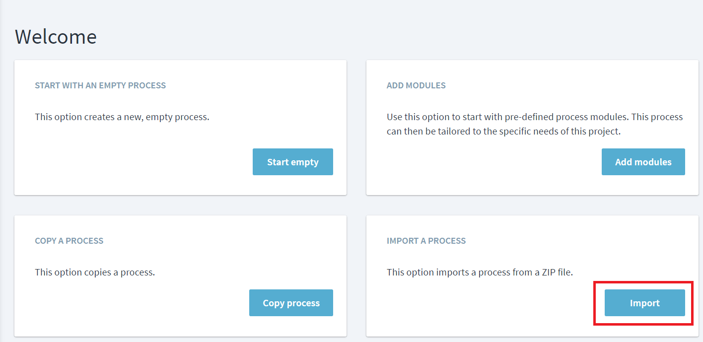 A predefined process in zip file format can be imported into Stages using the Import feature.