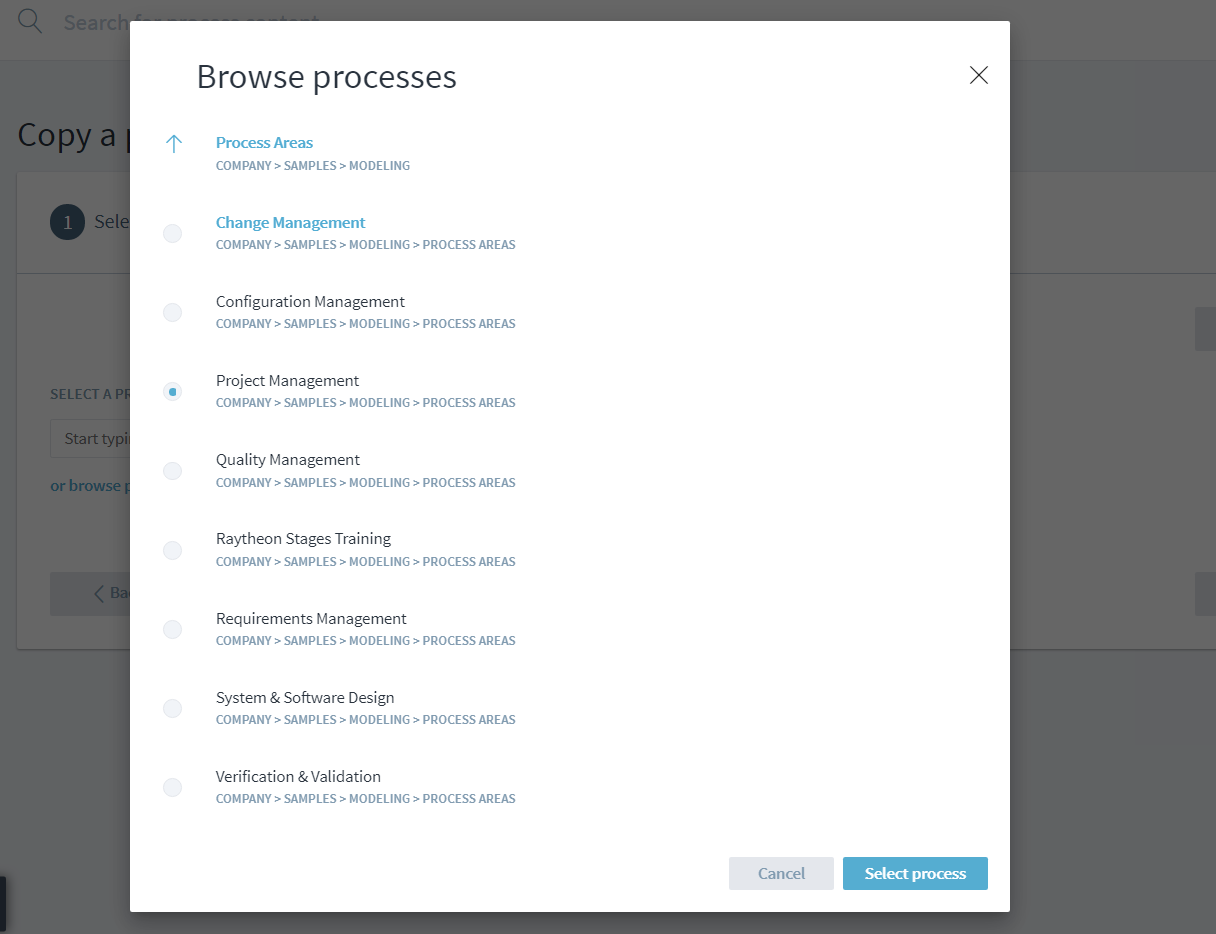 3. Then browse to the process that needs to be copied over, select it. Next select the version of the process that needs to be copied and complete the process creation.